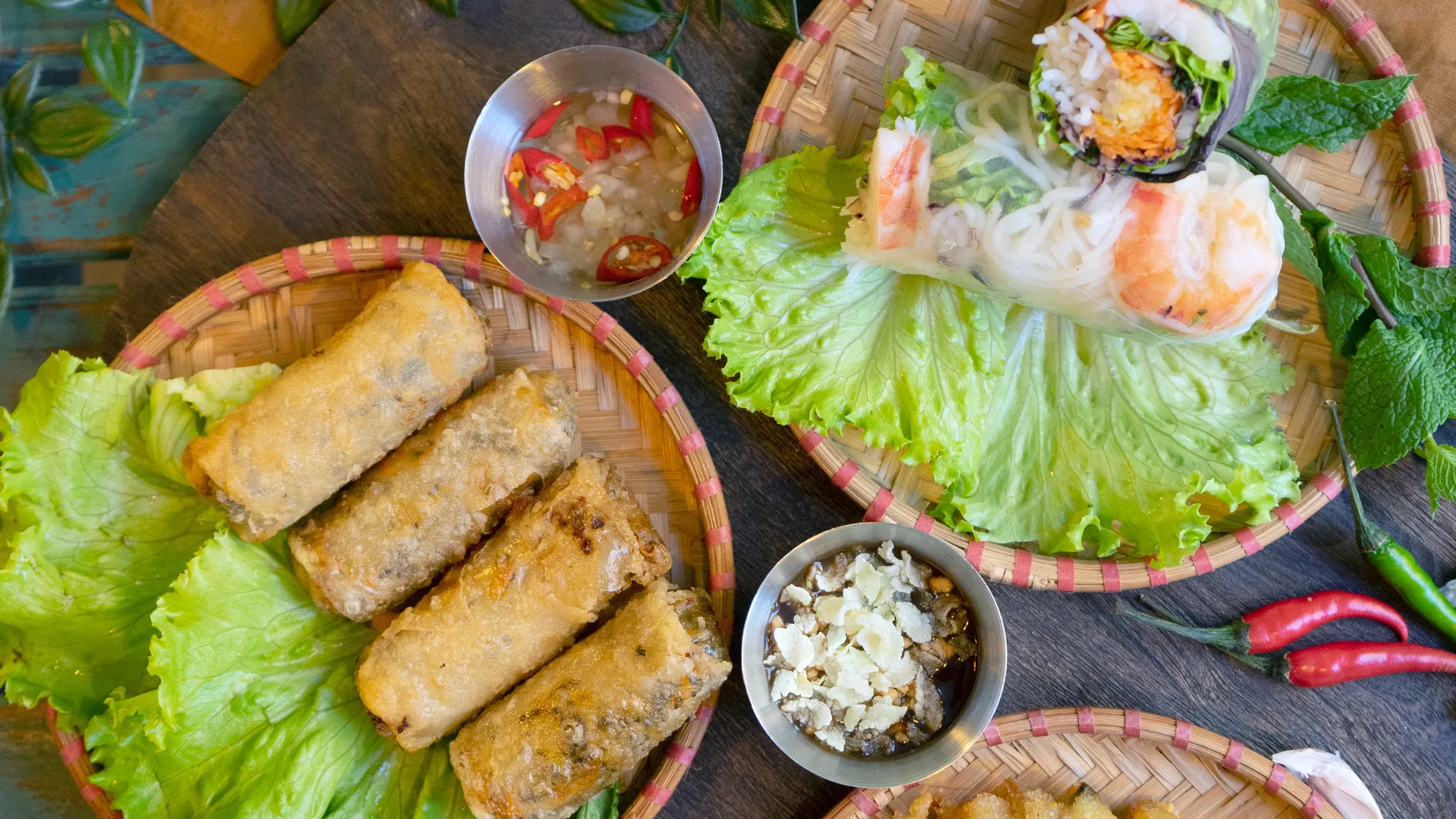 8,8 €Nems au poulet croustillants, accompagnés de salade fraîche et nuoc mam